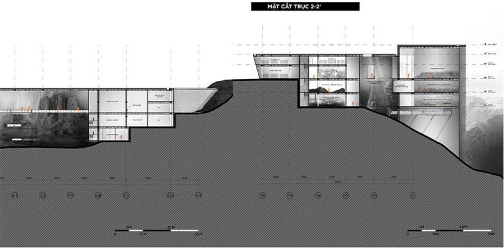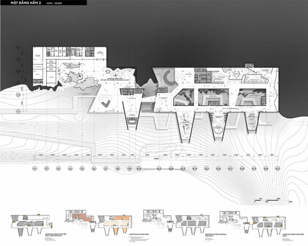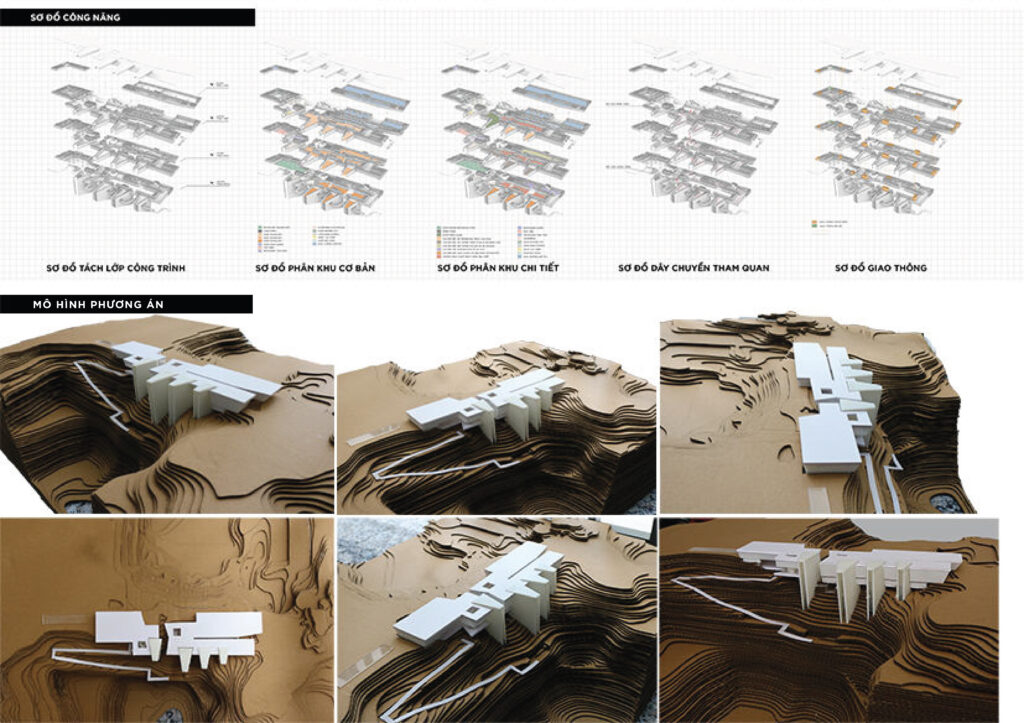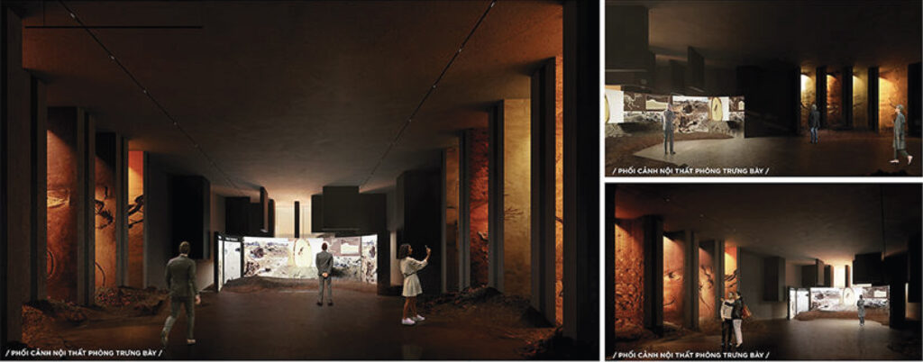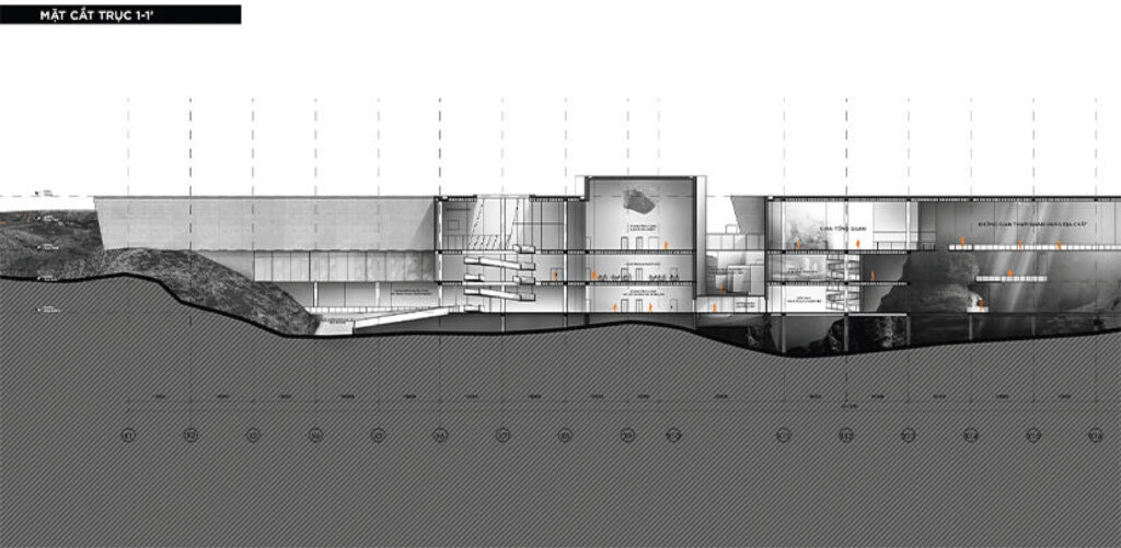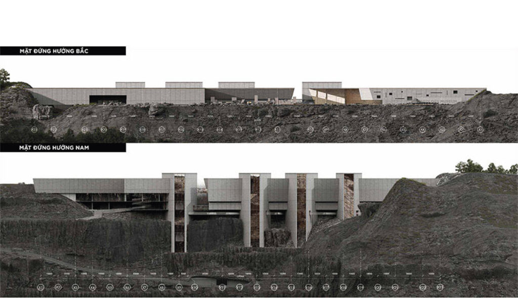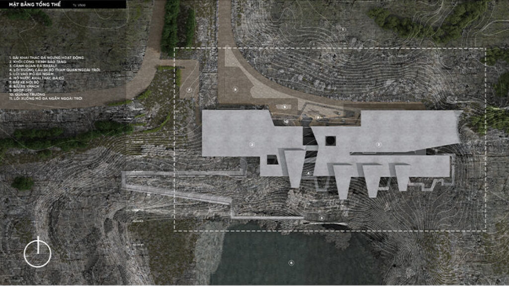 Với quy mô xây dựng trên khu đất có diện tích 5ha và tổng diện tích sàn 21.000m2, cao 3 tầng, đồ án đã nghiên cứu tận dụng yếu tố địa hình, khai thác bối cảnh tự nhiên để tạo nên một thiết kế ấn tượng nhưng vẫn có sự liên kết tốt giữa công trình và tự nhiên, khéo léo ẩn chứa trong đó hình tượng “quá khứ – hiện tại” để thể hiện ý niệm về mong muốn hồi sinh một mỏ đá bỏ hoang. Sự liên kết giữa công trình và tự nhiên được sinh viên nghiên cứu kỹ, thể hiện nhất quán từ tạo hình kiến trúc bên ngoài cho tới tổ chức mặt bằng, không gian trưng bày triển lãm bên trong, đồ án đã thành công khi kết hợp được nhiều yếu tố: hình thức vỏ bọc kiến trúc với các lớp địa tầng hiện trạng; ánh sáng tự nhiên, ánh sáng nhân tạo & công nghệ; không gian nội thất và yếu tố hang địa chất sẵn có từ giếng khoan của mỏ đá,.v..v.. Sự kết hợp này tạo nên các không gian trưng bày đa dạng và mang lại trải nghiệm ấn tượng cho khách thăm quan, đây cũng là điểm mạnh được các chuyên gia trong hội đồng đồng chấm giải đồng thuận đánh giá cao.