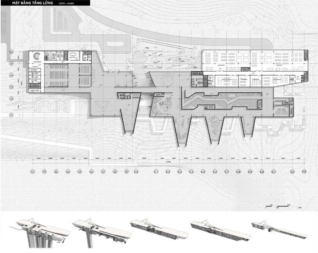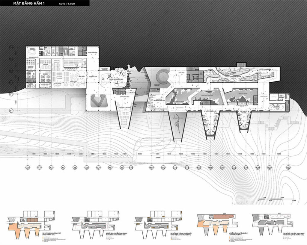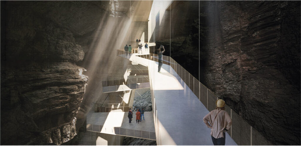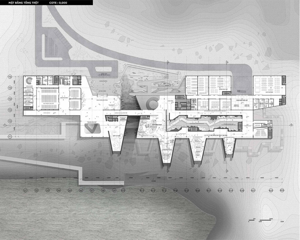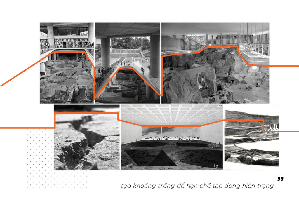 Với quy mô xây dựng trên khu đất có diện tích 5ha và tổng diện tích sàn 21.000m2, cao 3 tầng, đồ án đã nghiên cứu tận dụng yếu tố địa hình, khai thác bối cảnh tự nhiên để tạo nên một thiết kế ấn tượng nhưng vẫn có sự liên kết tốt giữa công trình và tự nhiên, khéo léo ẩn chứa trong đó hình tượng “quá khứ – hiện tại” để thể hiện ý niệm về mong muốn hồi sinh một mỏ đá bỏ hoang. Sự liên kết giữa công trình và tự nhiên được sinh viên nghiên cứu kỹ, thể hiện nhất quán từ tạo hình kiến trúc bên ngoài cho tới tổ chức mặt bằng, không gian trưng bày triển lãm bên trong, đồ án đã thành công khi kết hợp được nhiều yếu tố: hình thức vỏ bọc kiến trúc với các lớp địa tầng hiện trạng; ánh sáng tự nhiên, ánh sáng nhân tạo & công nghệ; không gian nội thất và yếu tố hang địa chất sẵn có từ giếng khoan của mỏ đá,.v..v.. Sự kết hợp này tạo nên các không gian trưng bày đa dạng và mang lại trải nghiệm ấn tượng cho khách thăm quan, đây cũng là điểm mạnh được các chuyên gia trong hội đồng đồng chấm giải đồng thuận đánh giá cao.