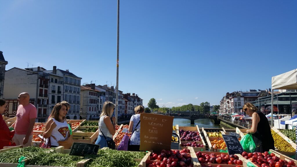 Tôi khá may mắn vì tới Bayonne dịp cuối tuần nên được tham dự phiên chợ địa phương, rất nhiều nông sản địa phương tươi ngon và giá thành rẻ được bầy bán tại đây. Cả khu chợ hiện lên đầy màu sắc bên con sông Nive một cách sống động. Sông Nive có vị trí rất quan trọng trong đời sống của người dân Bayonne. Những ngôi nhà cổ bám dọc theo con sông, đến nay đều là những vị trí đắc địa, trở thành khu vực thương mại, những quán hàng nhỏ xinh trải dọc con phố, từ rượu vang, đồ gia dụng hay những tiệm kẹo chocolat ngọt ngào… Chocolate là một trong những sản vật đặc trưng truyền thống mà người Bayonne luôn tự hào, cũng giống như rượu vin đối với người Bordeaux vây. Nổi tiếng nhất là Lễ hội Bayonne vào tháng Tám. Lễ hội Festayre, người tham dự trong trang phục màu trắng và khăn quàng đỏ, họ sẽ hát các bài hát, các điệu nhảy và trò chơi truyền thống, như pelota xứ Basque cùng các hoạt động gây nhiều tranh cãi hơn như đấu bò hoặc đua bò. Tuy vậy hàng năm đây vẫn là một trong các lễ hội thu hút được nhiều khách du lịch nhất nước Pháp.