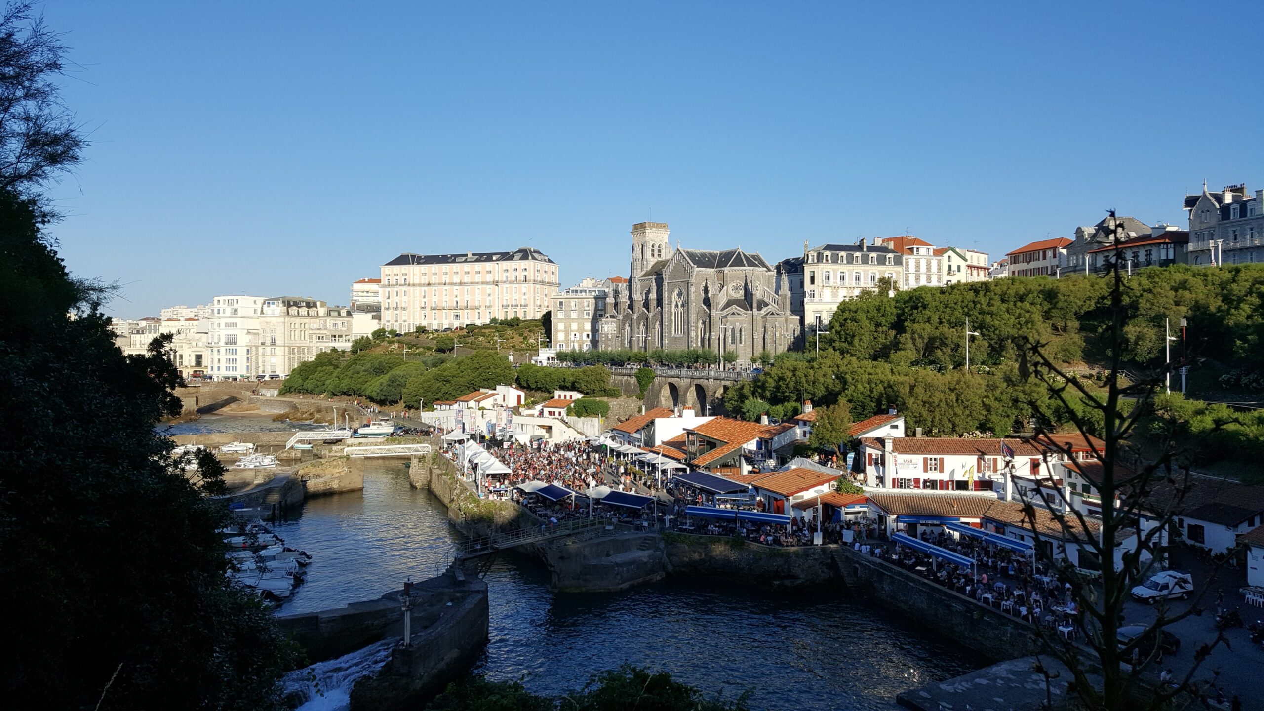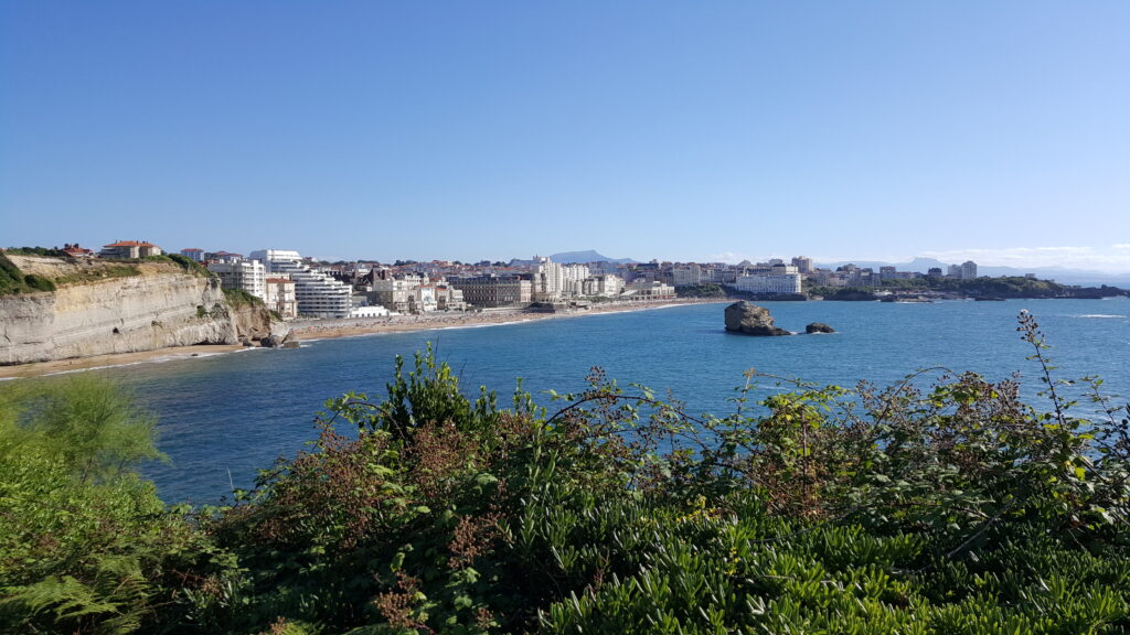 Tiếp theo chúng tôi di chuyển tới thị trấn biển Biarritz cách Bayonne chừng 15 phút ô tô. Biarritz được mệnh danh là thủ đô lướt sóng của thế giới. La Côte des Basques là bãi biển thu hút cả châu Âu đến đây với môn thể thao này từ những năm 1950. Chúng tôi được mời tới dự một buổi tiệc sinh nhật nho nhỏ trên một mỏm đồi để đón mặt trời lặn xuống biển lúc hoàng hôn. Khác ở Việt Nam, ta chỉ ngắm được mặt trời mọc lúc bình minh trên biển. Mỗi trải nghiệm đều có sự quyễn rũ khác nhau. Nhưng cảm nhận khi chứng kiến mặt trời chói lọi, to lớn dần lặn xuống biển để lại những vệt sáng ấm áp, lặng lẽ rồi từ từ biến, mất thật khó quên. Đô thị nơi đây vừa hoang dã với các bãi đá dài ven bờ biển, mà vẫn có sự ngăn nắp, chỉn chu. Điều tôi nhận thấy tại thành phố biển này quả rất rõ ràng, thiên nhiên và những thứ con người tạo ra hòa vào nhau đẹp đẽ. Dù đã biết nhưng phải thốt lên: công tác quy hoạch, việc chấp hành quy chế đô thị của nước bạn quá tuyệt vời, ngăn nắp quy củ và chuẩn mực. Những bãi biển tuyệt đẹp trong vắt luôn kín người. Chỉ cần một chiếc khăn và chút đồ ăn nhẹ, bạn có thể thưởng thức trọn ngày để phơi nắng trên bãi biển và nghe tiếng sóng rì rào. Tại đây mọi hình thức kinh doanh phải thụt vào 20m so với vạch nước biển. Vì vậy mà bờ biển là sở hữu của toàn dân. Đây là một thực trạng nhức nhối tại Việt Nam khi mà, phần lớn các quy hoạch, cụ thể là quy hoạch không gian “mặt tiền” biển vẫn được thực hiện dựa trên tư duy quy hoạch đô thị chứ không dựa trên các nguyên tắc quy hoạch không gian điểm đến du lịch biển. Theo đó các không gian hướng biển bị phân lô và tư nhân hóa, một loạt các công trình dịch vụ du lịch (khách sạn, nhà hàng, cửa hàng mua sắm…) sẽ tập trung dọc trục giao thông chạy song song đường bờ biển. Điều đó dẫn đến không còn không gian công cộng hoặc không gian dành cho cuộc sống cộng đồng, giảm sức hấp đẫn của du lịch đô thị biển.