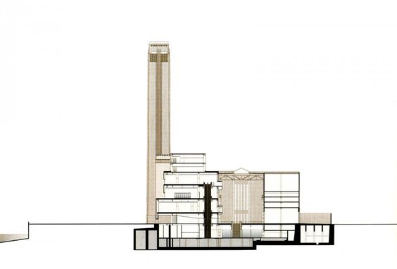 Herzog & de Meuron đã nhận ra sức mạnh vật lý của Bankside, xuất phát từ khái niệm tổng thể của công trình, nghĩa là từ “tính đối xứng của công trình của Scott”, từ bộ phận không gian ba bên trong công trình và trong các yếu tố riêng lẻ, như trong hình khối của ống khói, không gian của hội trường tuabin và kích thước và đặc điểm kiến trúc của các cửa sổ. Bằng cách đặt các phòng trưng bày với các chất lượng không gian khác nhau trong mỗi không gian theo chiều dọc, can thiệp của Herzog & de Meuron đã thể hiện sự tôn trọng phân chia không gian ba bên của công trình hiện tại. Kết nối vật lý duy nhất với không gian hai bên là tầng quan sát, lối vào đi qua sảnh tuabin ở cốt cao độ tầng trệt. Ba không gian này được kết nối trực quan hơn bởi hai hộp kính mờ dài và ngắn, dường như được treo từ cấu trúc thép chính cũ, nhìn ra sảnh tuabin từ các hành lang của phòng trưng bày đặt trong nhà nồi hơi. Các hộp này được sắp xếp theo chiều dọc và chiều ngang tạo ra một cấu trúc đối xứng tĩnh của các khối được đặt trên lưới cấu trúc cũ. Cả hai không gian bên, nhà nồi hơi và nhà chuyển mạch được chia theo chiều dọc thành một số tầng. Chỉ có hội trường tuabin vẫn trống rỗng với chiều cao toàn bộ công trình.
