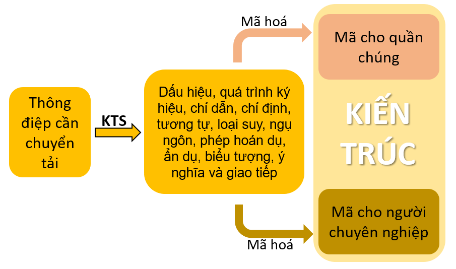 Theo Charles Jencks, một trong những thuộc tính của kiến trúc hậu hiện đại – chiến lược chính mà các KTS vận dụng để làm rõ tính đa nguyên của văn hóa – là mã hóa kép: hoà trộn gu chuyên môn và kỹ năng kỹ thuật của họ với sở thích những khách hàng cuối cùng của họ – người dân [2]. Kiến trúc không phải là một giao dịch hoàn toàn riêng tư giữa KTS và khách hàng. Nó ảnh hưởng đến tất cả mọi người, vì vậy nó phải dễ hiểu đối với mọi người (Blair Kamin) [1]. Thứ nhất, ngôn ngữ hàn lâm bao gồm nhiều khái niệm, chẳng hạn như hình thức, chức năng, kiến tạo, quy mô, tỷ lệ, đối xứng, nhịp điệu, v.v. Chúng sắp xếp tư duy của KTS cả trong quá trình phát triển của dự án và “quá trình giải mã” của nó. Nhờ nó, KTS nói chuyện với các chuyên gia khác (nhà lý thuyết, nhà thực hành, nhà phê bình, các ngành nghề liên quan). Thứ hai là ngôn ngữ “bình dân” của hình khối kiến trúc, tức là ngôn ngữ nghệ thuật đặc biệt cho phép thể hiện ý tưởng và ý đồ nghệ thuật trong chất liệu của bố cục, có thể được cảm thụ bởi đông đảo công chúng. Đứng ở một góc độ nào đó, sự tạo tác kiến trúc lại mang dáng dấp của ký hiệu học, trong đó có sự vận dụng đáng kể các ký hiệu và quá trình ký hiệu, biểu hiện, chỉ định, cú pháp, sự giống nhau, tương tự, phép ẩn dụ, biểu tượng, ý nghĩa và thông tin liên lạc. Khác với ngôn ngữ học, ký hiệu học kiến trúc nghiên cứu các hệ thống dấu hiệu phi ngôn ngữ nhằm truyền tải thông điệp của công trình kiến trúc.
