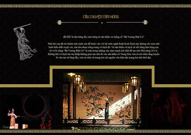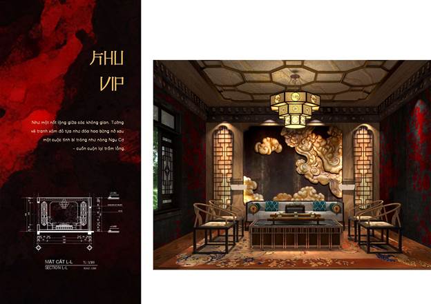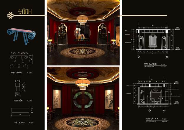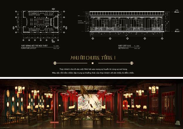 Các không gian ẩm thực bên trong được thiết kế khá chăm chút với nhiều chi tiết tinh tế, được nhấn mạnh với các thủ pháp chiếu sáng tập trung vào một vài điểm cần thiết tạo cảm giác ấn tượng cho thực khách. Tuy nhiên càng vào bên trong, lên tầng 2 tác giả hơi tham các chi tiết truyền thống khiến các nét đương đại giảm dần, không gian trở nên nặng về phong cách truyền thống Trung Hoa hơn. Nếu giữ được nét đương đại như ở sảnh thì đồ án sẽ tốt hơn.