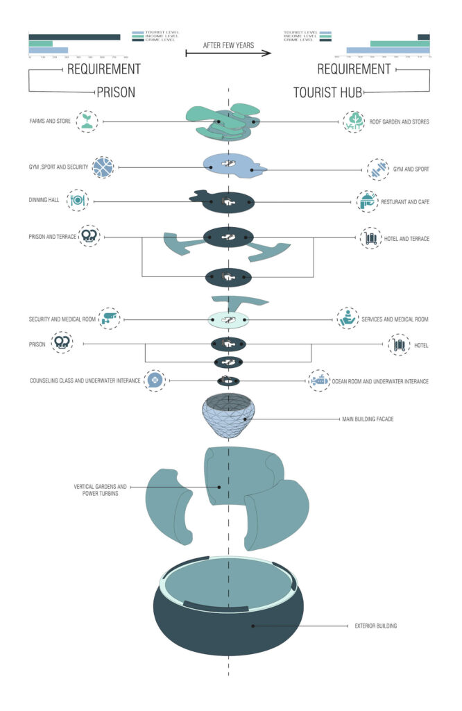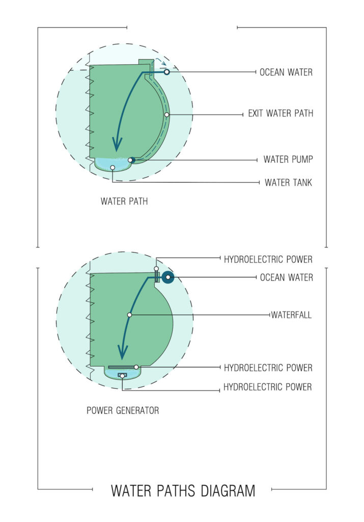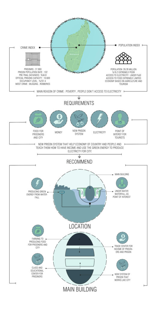 Giải pháp của nhóm thiết kế cho cuộc khủng hoảng hiện tại và biến nó thành cơ hội kinh tế tốt nhất trong tương lai, là sản xuất điện liên tục từ các thác nước lớn và nối tiếp như thác Niagara, nhưng lần này là ở đại dương. Những thác nước sâu lớn bao quanh nhà tù với cách tiếp cận rất có chủ đích tạo ra một cảnh quan tuyệt đẹp khác của đảo Madagascar như một điểm thu hút khách du lịch, và nhiều du khách sẽ đến đó để ngắm nhìn cảnh quan tuyệt đẹp này.