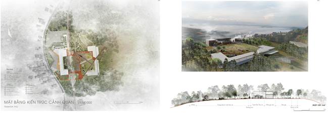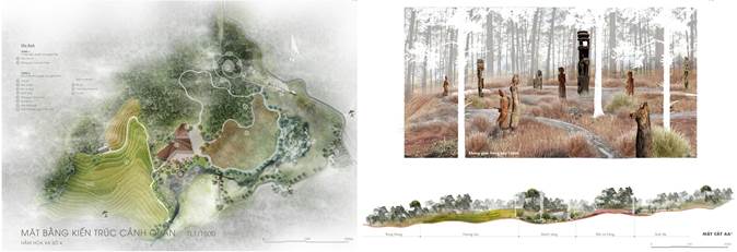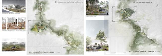 Kiến trúc cảnh quan mỗi không gian mang hơi thở cảnh quan đồi núi, rặng thông, dấu tích kiến trúc Pháp và pha lẫn màu sắc bản địa thông qua các ngôn ngữ: landform architecture (kiến trúc hình thể) và biophilic architecture (kiến trúc bắt nguồn từ cảm hứng sinh thái).